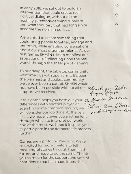 In 2019, I found myself in a contemplative phase, questioning whether dialogue is even possible in our polarised times. That's when I came across a Kickstarter campaign launched by Zain Memon, co-founder of Memesys Studio. Zain had created SHASN - The political strategy board game, and was seeking backers. The campaign stated,