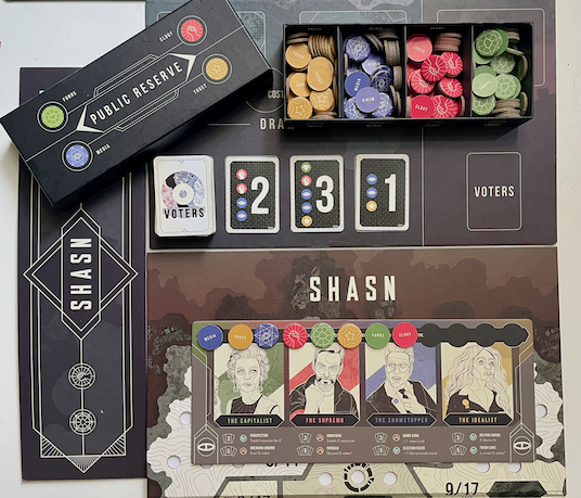 “SHASN is an engaging board game that combines politics, ethics, and strategy. Players take on the roles of politicians competing in a national election, making tough policy decisions, influencing voters, and outmaneuvering opponents to secure political power.”